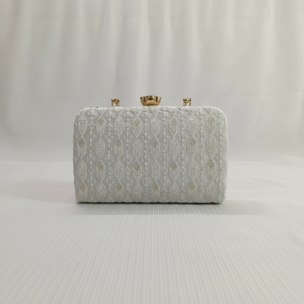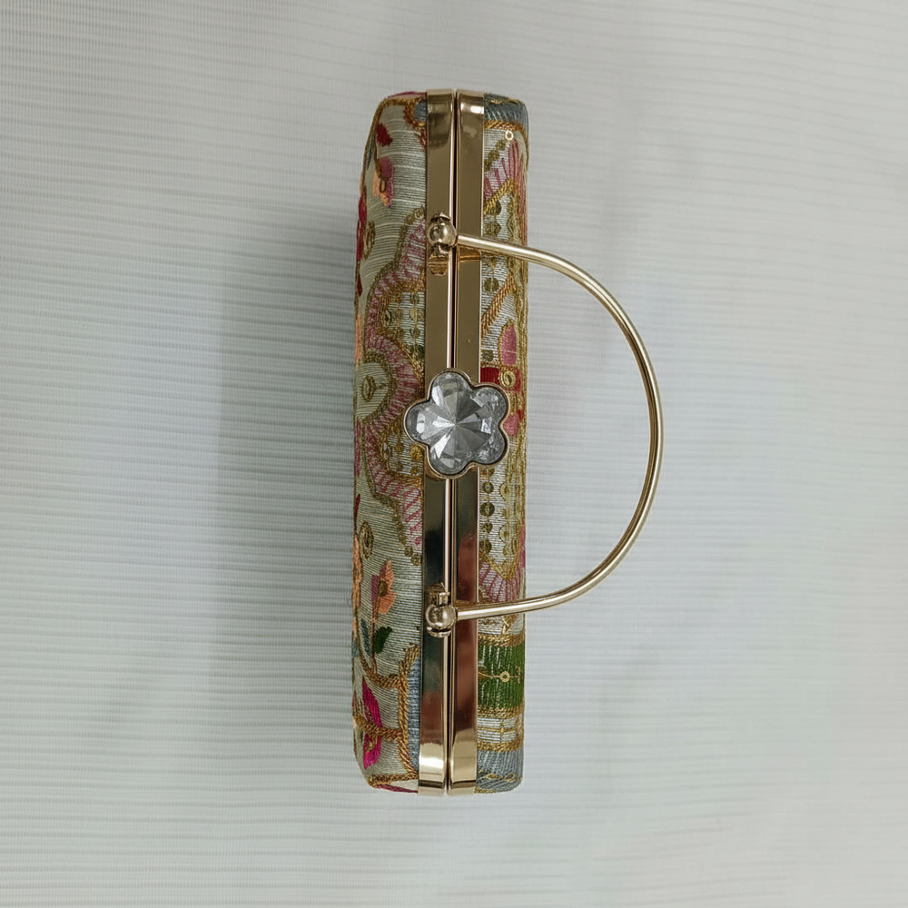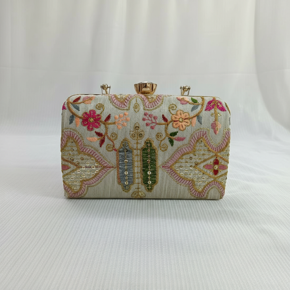 A rectangular evening clutch bag featuring intricate colored embroidery and sequin embellishments on an ivory-ribbed fabric base. The design includes floral motifs and geometric borders. It has a gold-tone metal frame and a decorative floral-shaped clasp with a central crystal.